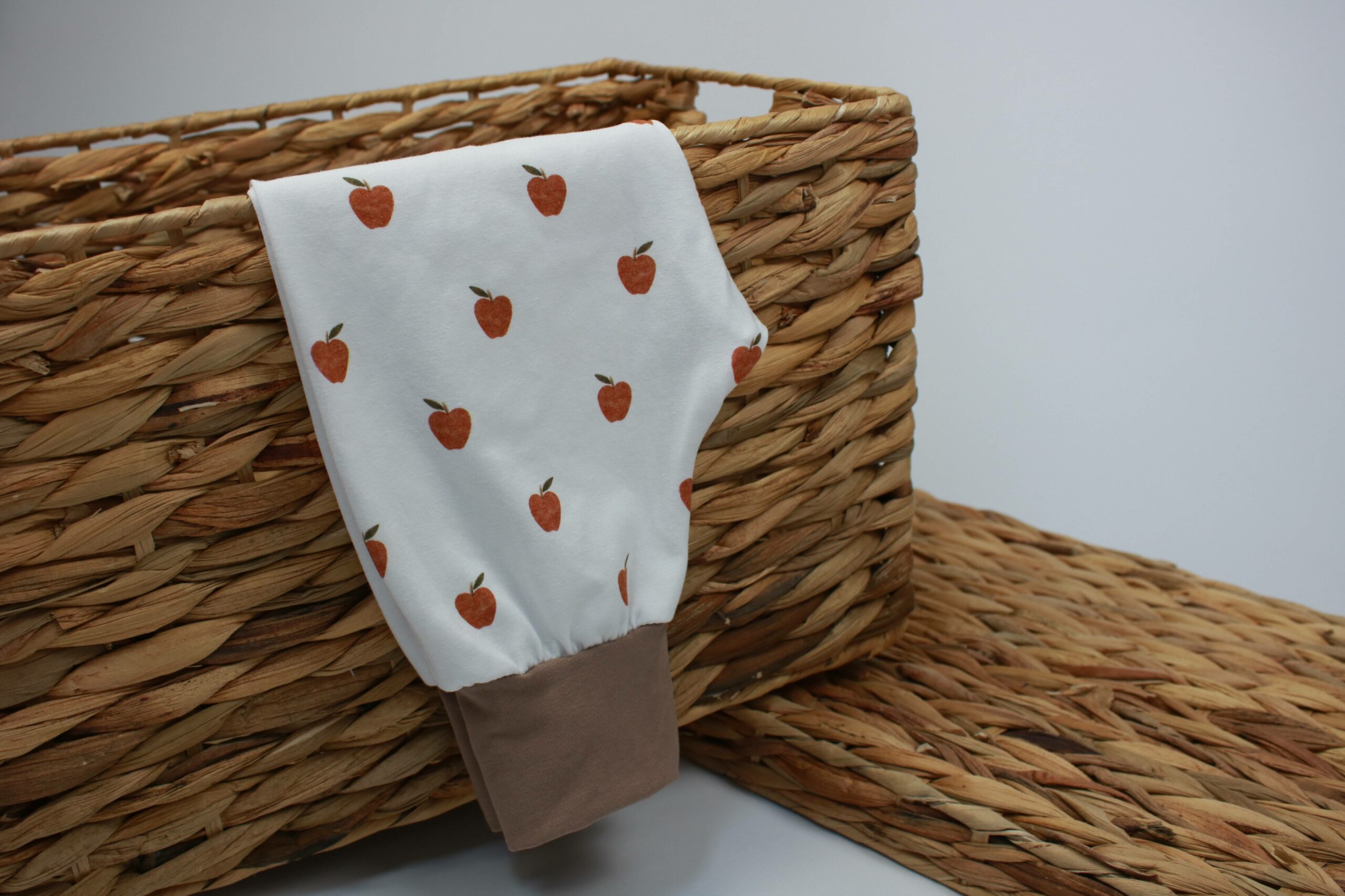 Farbe: weiß mit roten Apfelmotiven, braune Bündchen in der Farbe „Kakao“