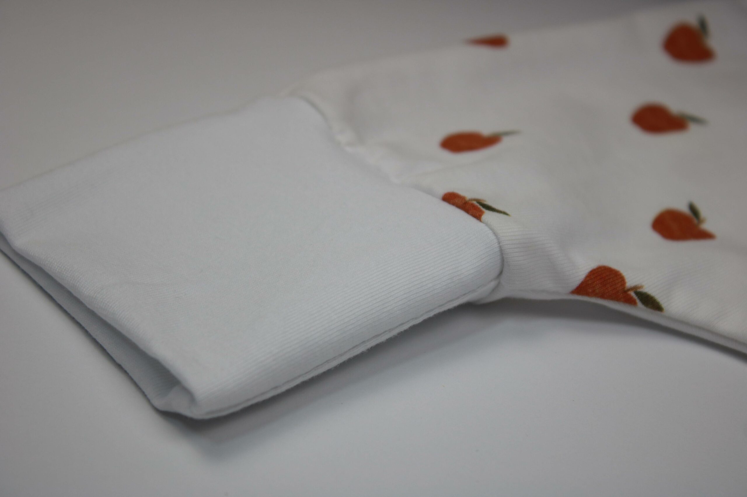 Der weit geschnittene „Apfel Strampler“ aus Biobaumwolle hat praktische Druckknöpfe an den Trägern. Er ist in komfortablen Doppelgrößen erhältlich. Für die jeweils kleinere Größe können die langen Beinbündchen einfach umgeschlagen und somit verkürzt werden. Später kann die komplette Länge genutzt werden, so habt ihr an dem Strampler möglichst lange Freude. Die Knopfleiste hat keine Funktion, die schönen Bio-Olivenholzknöpfe sind nur dekorativ am Vorderteil angebracht.