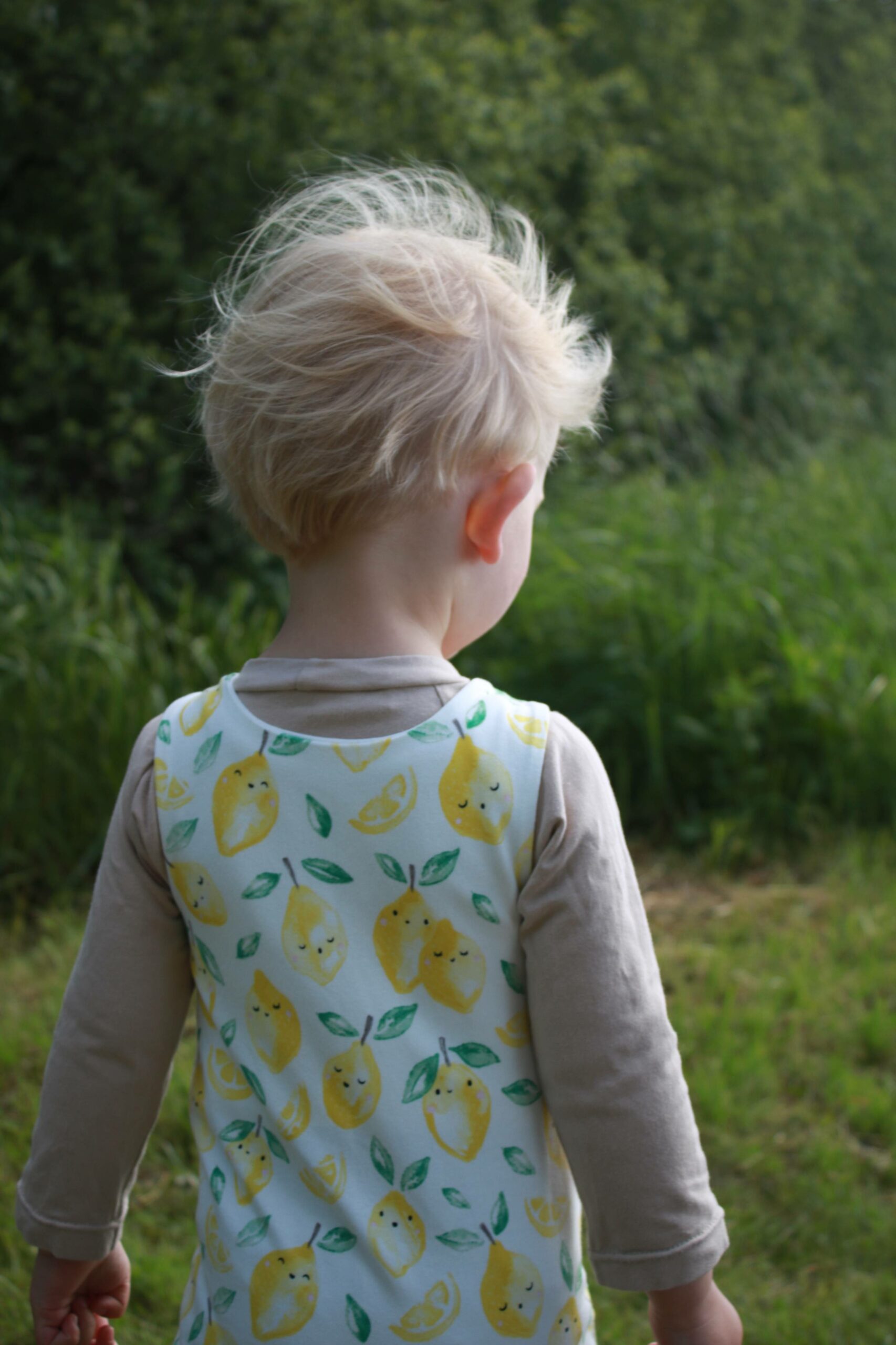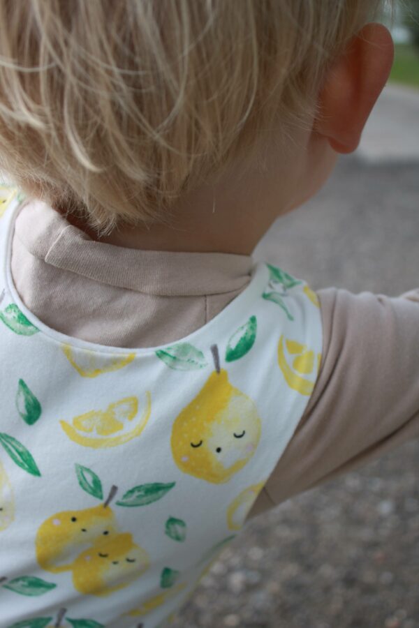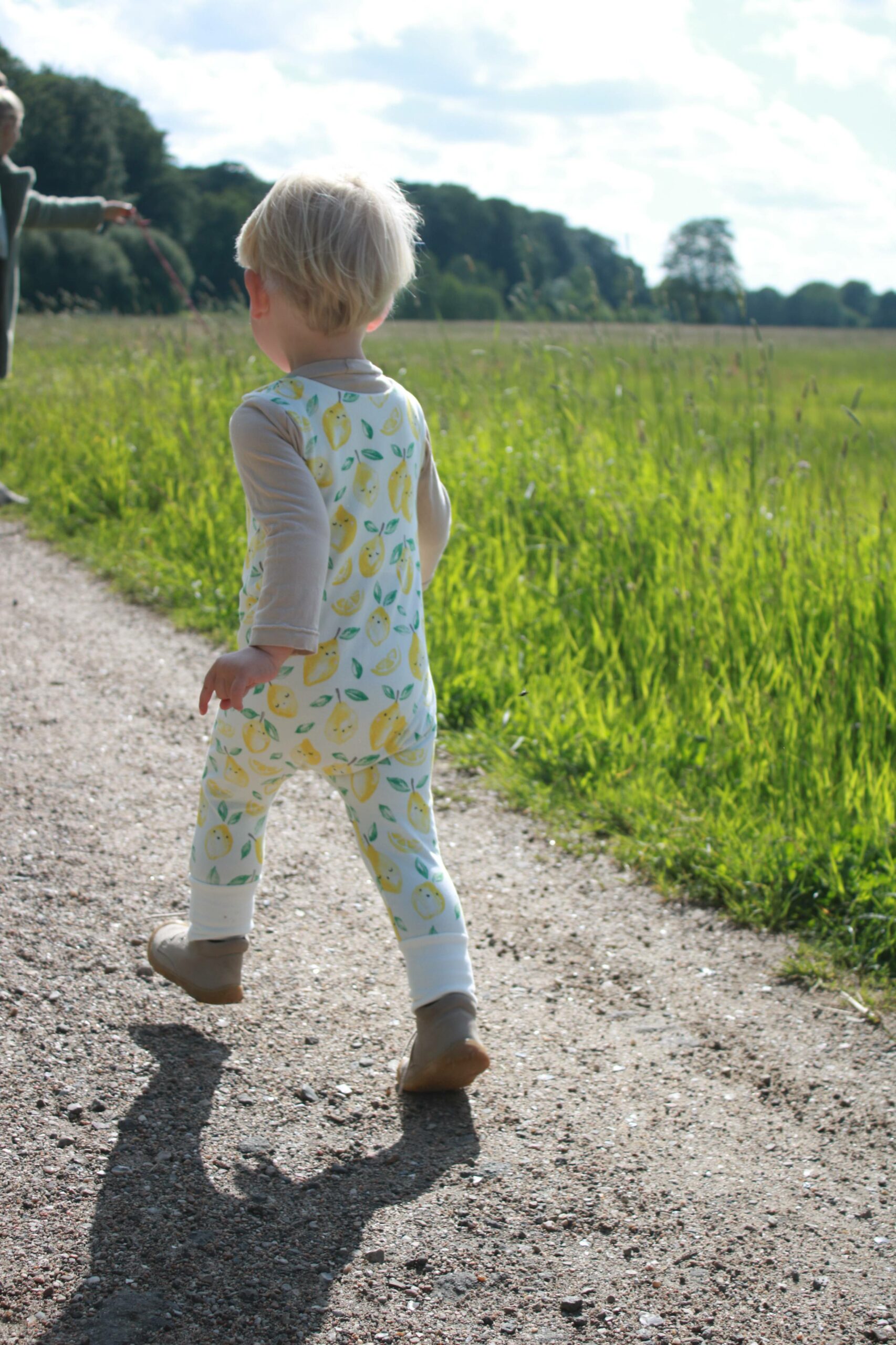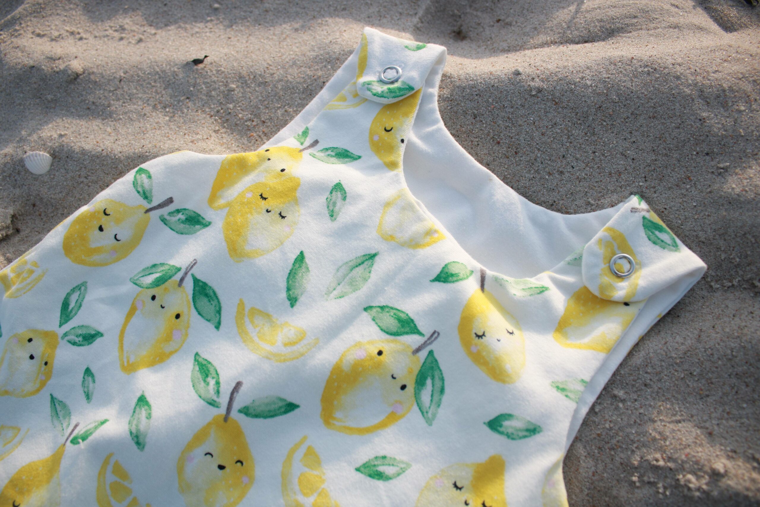 Der sommerliche „Lemon Strampler“ aus Biobaumwolle ist mit praktischen Druckknöpfen an den Trägern ausgestattet. Er ist in komfortablen Doppelgrößen erhältlich. Für die jeweils kleinere Größe können die langen Beinbündchen einfach umgeschlagen und somit verkürzt werden. Später kann die komplette Länge genutzt werden, so habt ihr an dem Strampler möglichst lange Freude.