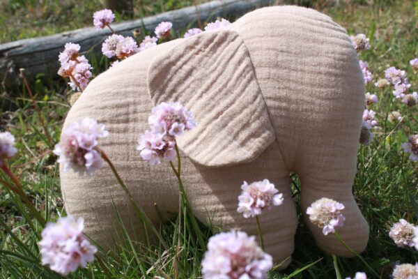 Schmuseelefant aus Baumwoll-Musselin in Bioqualität, gefüllt mit weicher Maiswatte (nach DIN EN 71-3 spielzeugtauglich).