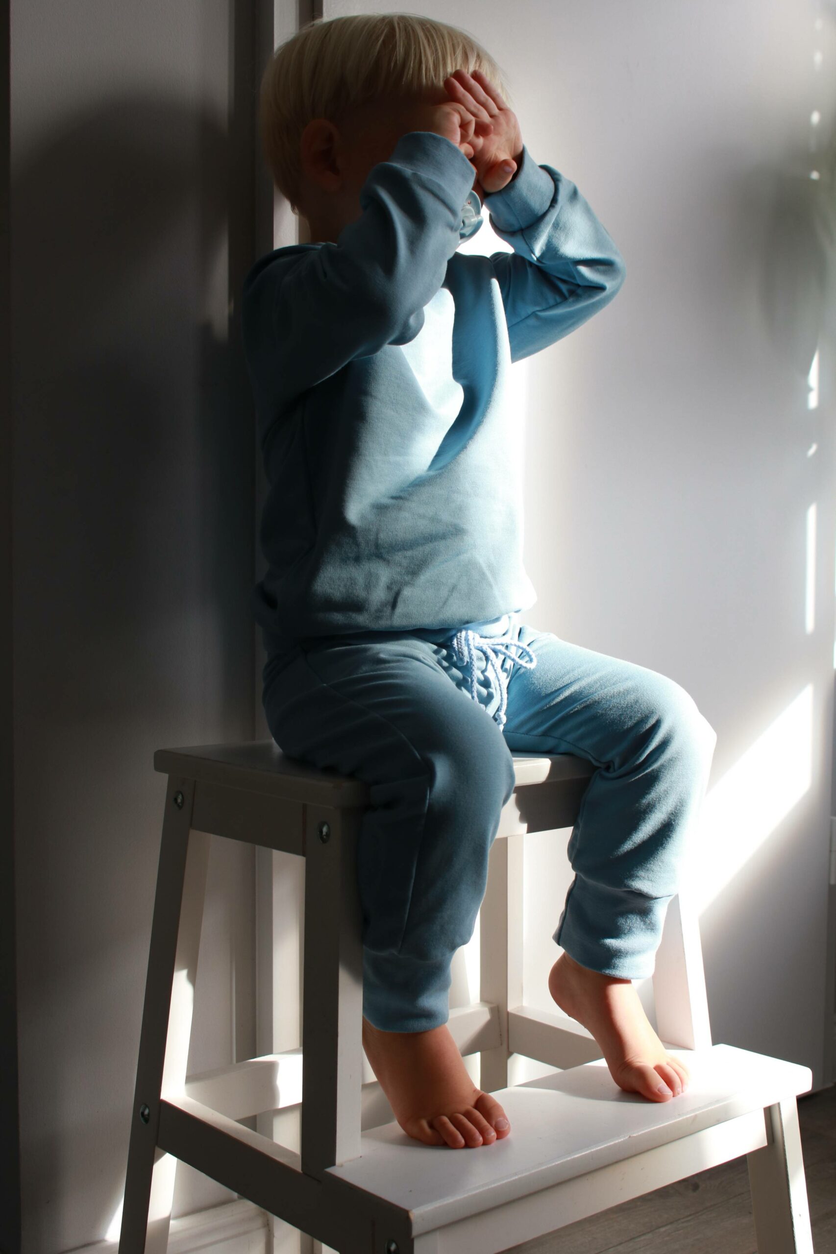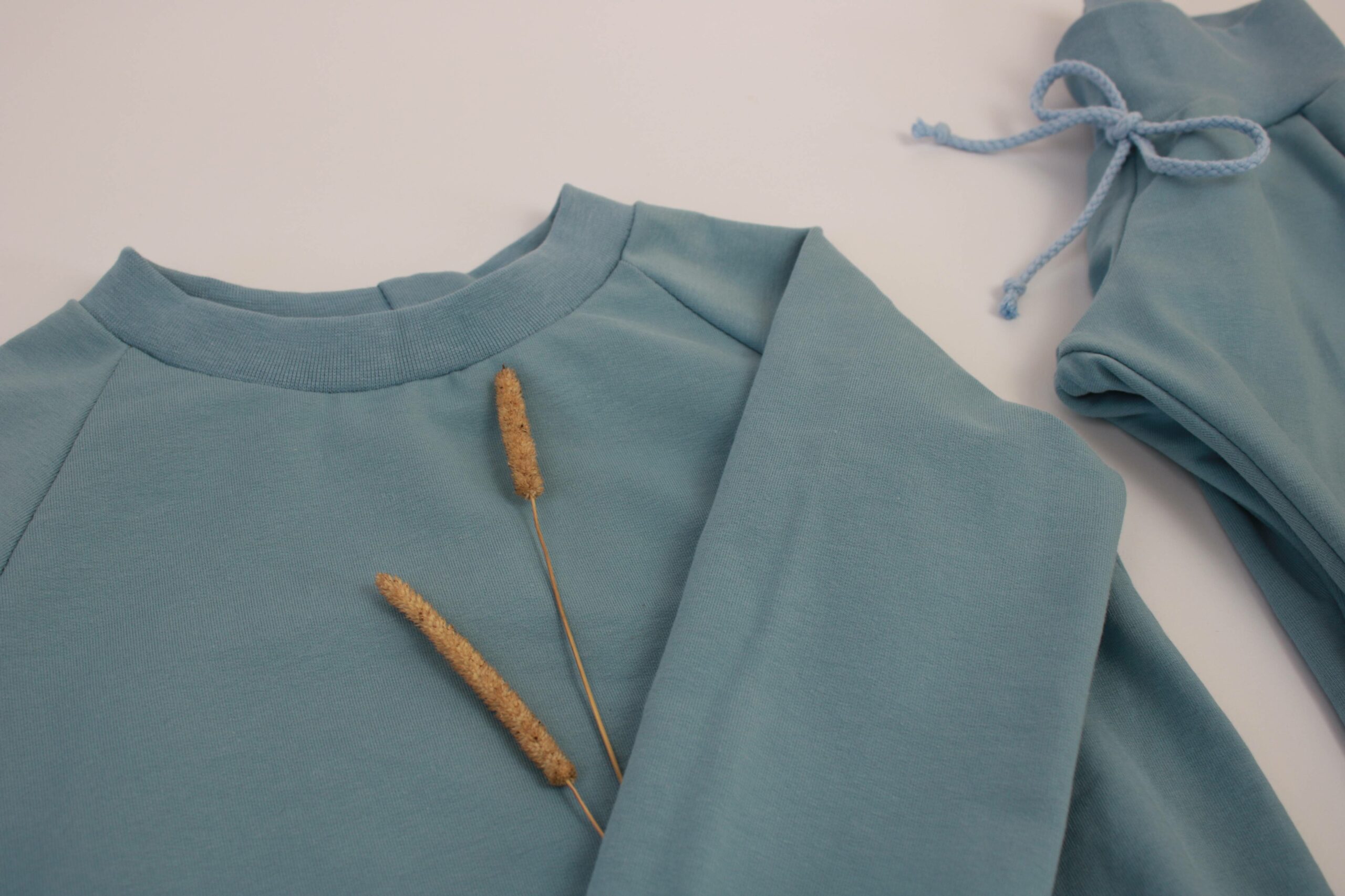 Dieses bequeme Set besteht aus einem Raglan-Sweatshirt und einer Jogginghose in der Farbe „Ozeanblau“. Beides besteht aus einem leichten Sweatstoff aus Biobaumwolle. Die Raglanärmel des Shirts sitzen besonders bequem und machen das Aus- und Anziehen sehr angenehm. Die Hose hat seitliche Taschen, einen dehnbaren Bauchbund und lange Beinbündchen, die der gewünschten Größe entsprechend hochgekrempelt oder in voller Länge genutzt werden können. Die Kordel für die Schleife hat nur einen dekorativen Zweck.