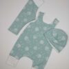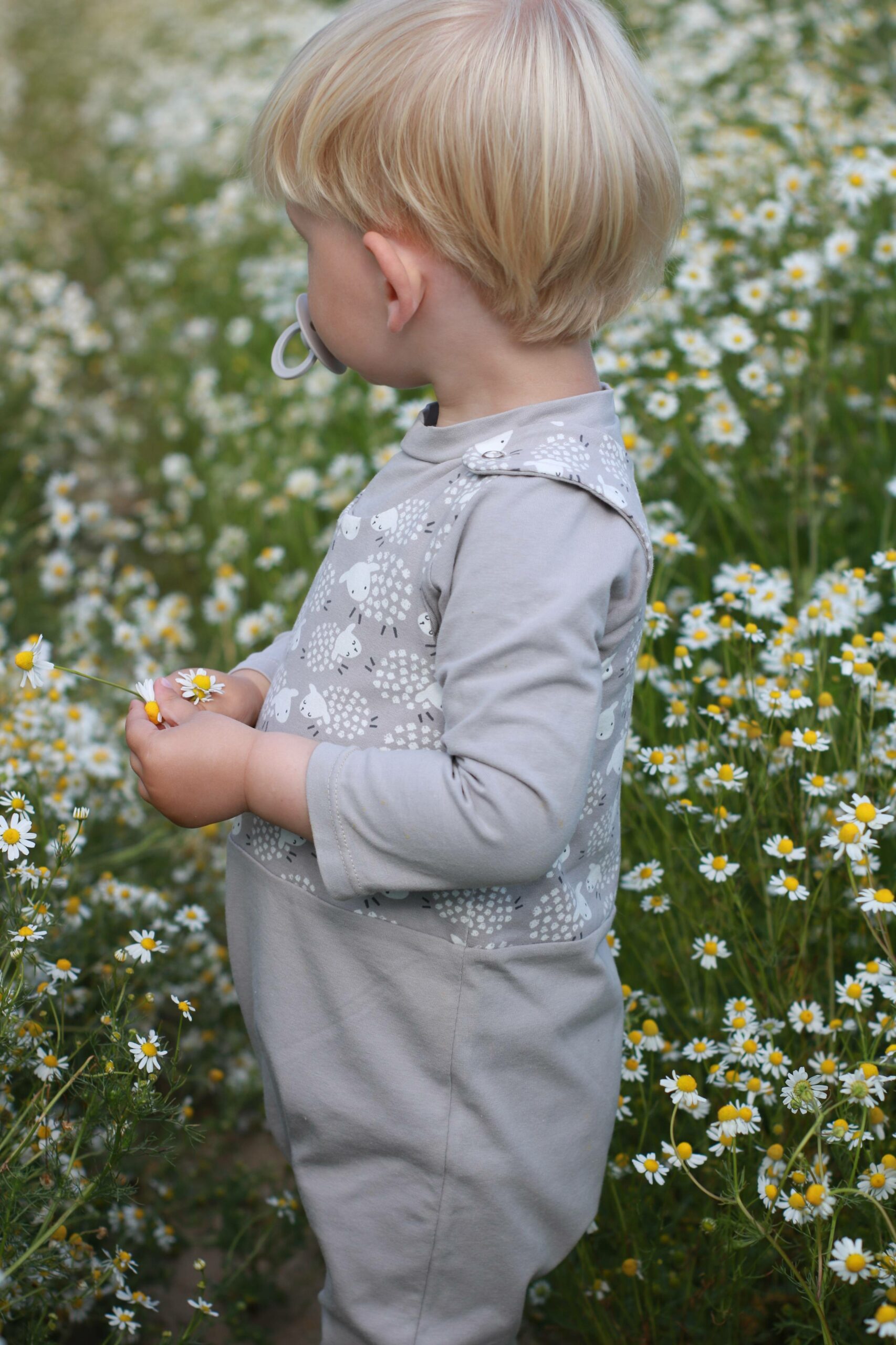 Das Herzstück vom „Schäfchen Set“ ist der weit geschnittene Strampler mit Schafmotiven. Das Raglanshirt lässt sich perfekt dazu kombinieren und ist dank der kleinen Tasche auch ohne Strampler ein süßer Hingucker. Für den Komplettlook gibt es dazu noch die passende Mütze. Der Strampler ist mit praktischen Druckknöpfen an den Trägern ausgestattet und ebenso wie das Shirt in Doppelgrößen erhältlich. Für die jeweils kleinere Größe können die langen Beinbündchen einfach umgeschlagen und somit verkürzt werden. Später wird dann einfach die komplette Länge genutzt. Alternativ zum Beinbündchen kann auch ein gemütliches Füßchen am Strampler gewählt werden.
