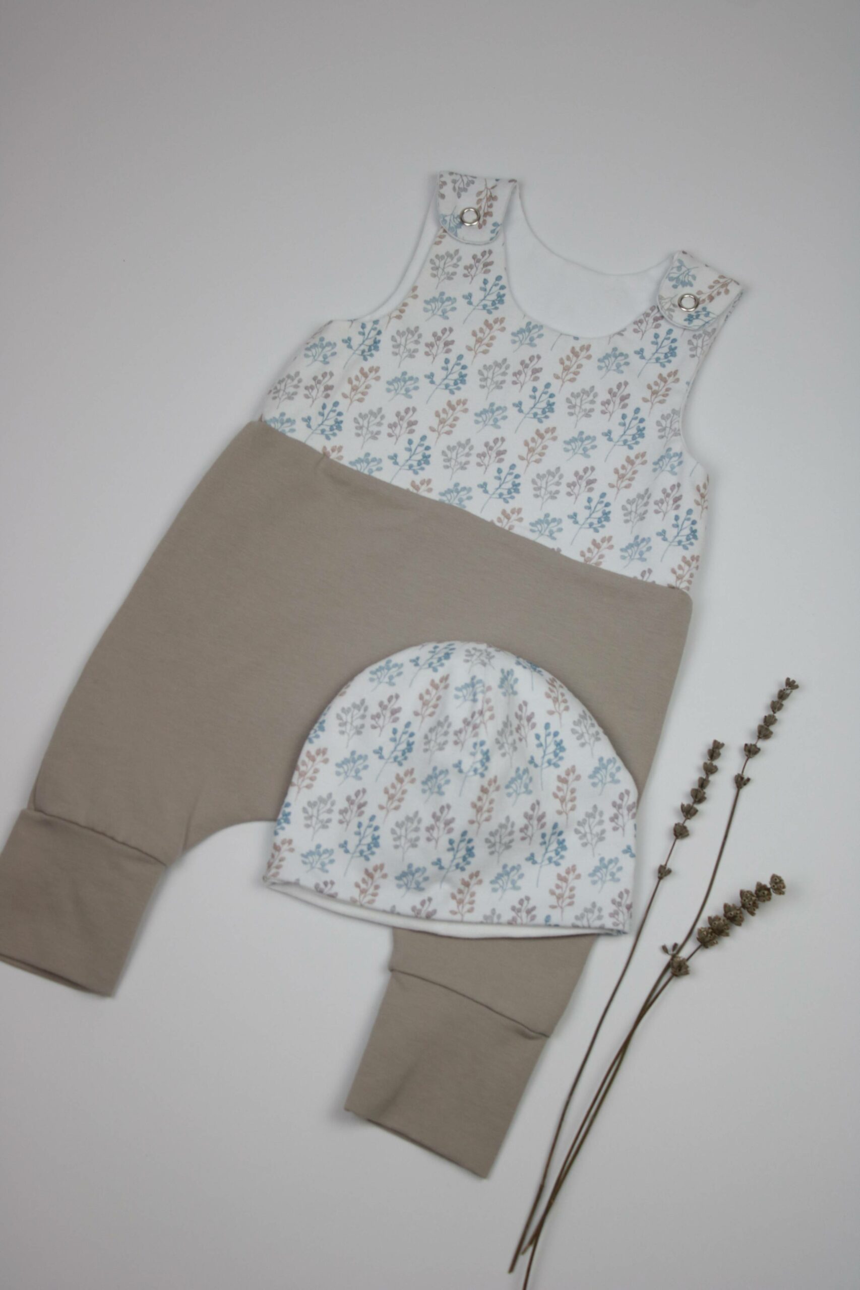 Das Herzstück vom „Wiesentraum Set“ ist der weit geschnittene Strampler. Dazu gibt es eine Leggings im selben Muster und eine passende Mütze. Der Strampler ist mit praktischen Druckknöpfen an den Trägern ausgestattet und ebenso wie die Hose in Doppelgrößen erhältlich. Für die jeweils kleinere Größe können die langen Beinbündchen einfach umgeschlagen und somit verkürzt werden. Später wird dann einfach die komplette Länge genutzt. Als Alternative zum Beinbündchen kann für den Strampler aber auch ein gemütliches Füßchen gewählt werden, was gerade bei den ganz Kleinen sehr bequem und praktisch ist.